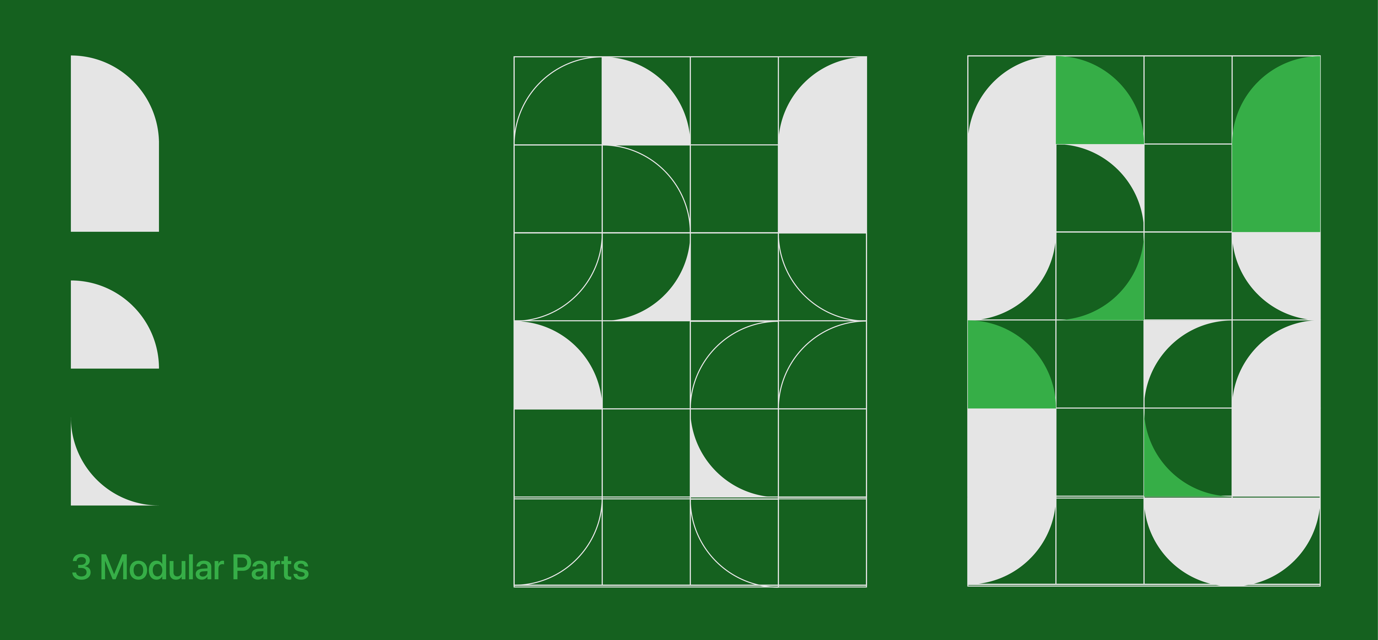 Modular Mosaic is a display font featuring monospaced widths across all glyphs. It is a modular typeface, in which every letterform is assembled from a restricted palette of three shapes, which have been repeated, flipped, and mirrored, but not scaled.